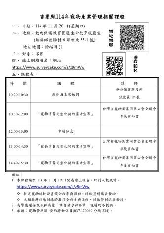一、配合氣象預報颱風可能影響本縣地區,為顧及人員及講師安全,延期辦理。 二、延期後之時間訂於114年11月20日(星期四)上午10時30分,地點不變(動物保護教育園區生命教育視聽室)。 三、已完成報名者,報名資料將自動保留。 四、檢附課程表如附件,敬請轉知相關業者及志工,並惠予配合,敬請 諒達。